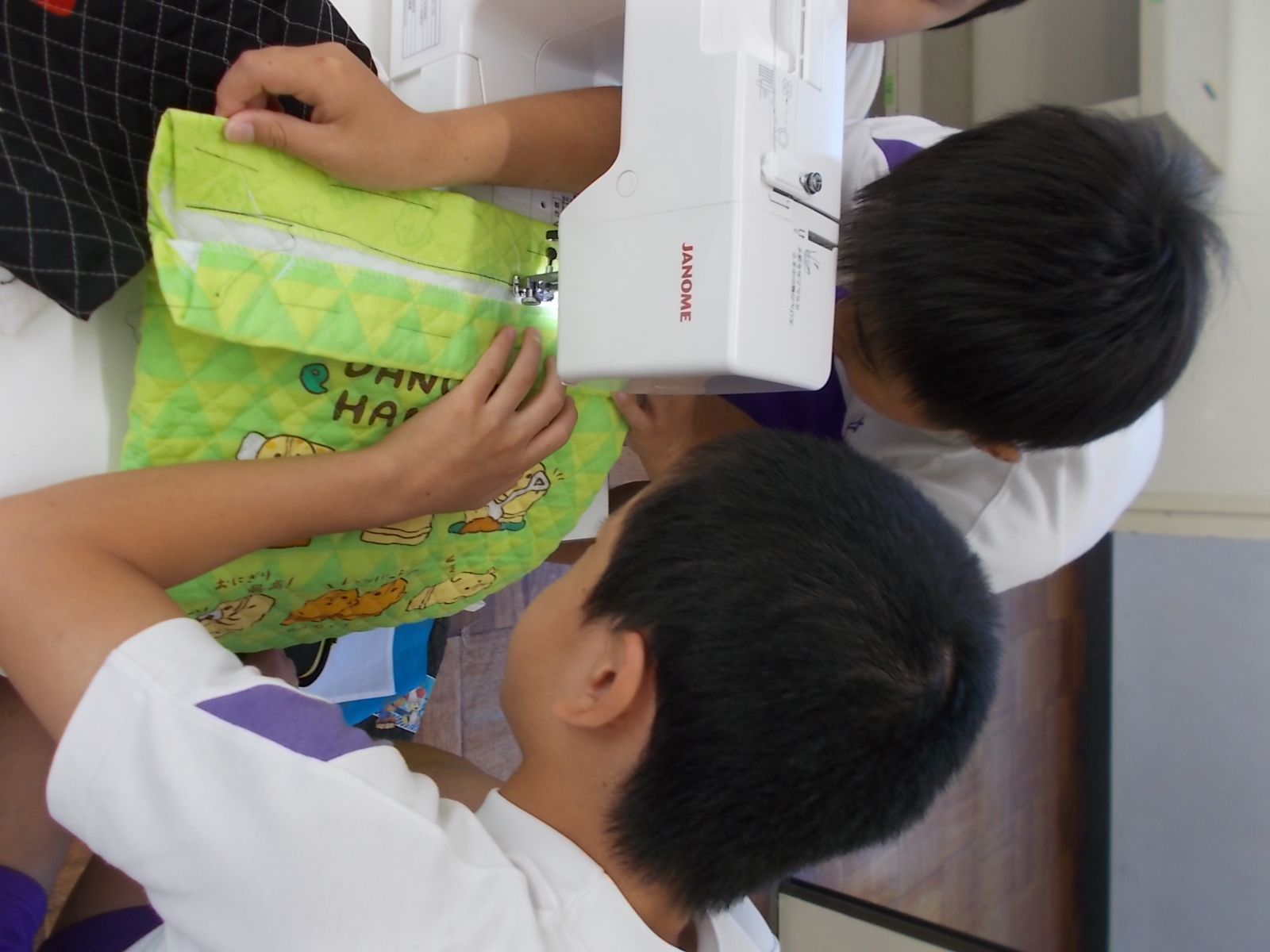 5年生は家庭科でミシンを使ってナップザック作りをしています。ミシンの扱いは、ほとんどの子が初めてなのですが、ボランティアでお世話になった保護者の方々のおかげもあり、今は友だちと教え合いながら、手助けしながら、真剣に慎重に作業を進めていました。ミシン目は際をまっすぐに縫えており、なかなかの出来栄えです。 |