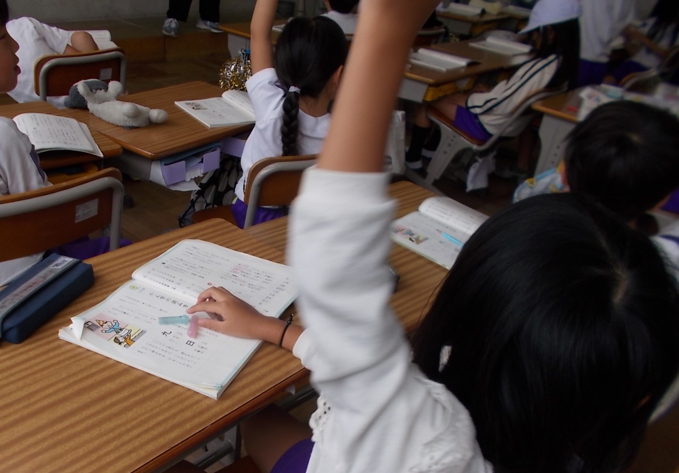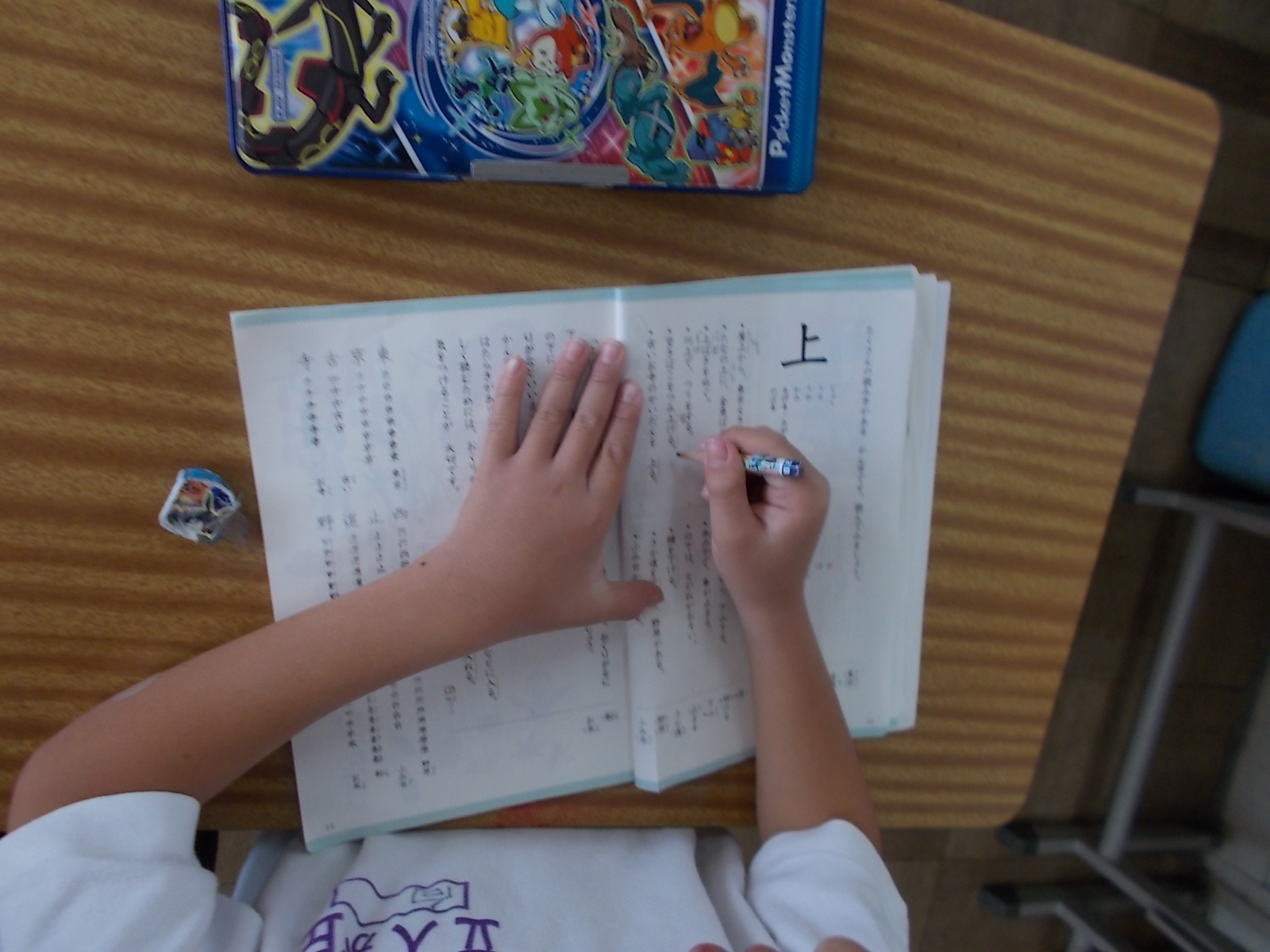 「いろいろなかん字の読み方を正しく読もう」ということをめあてとして、一つの漢字でも音読みと訓読みを合わせるとたくさんの読み方があることを知る学習をしています。この日の授業では、「上」と「下」の漢字を中心に、どんな読み方があるかをいろいろな場面に当てはめて考えていました。 |