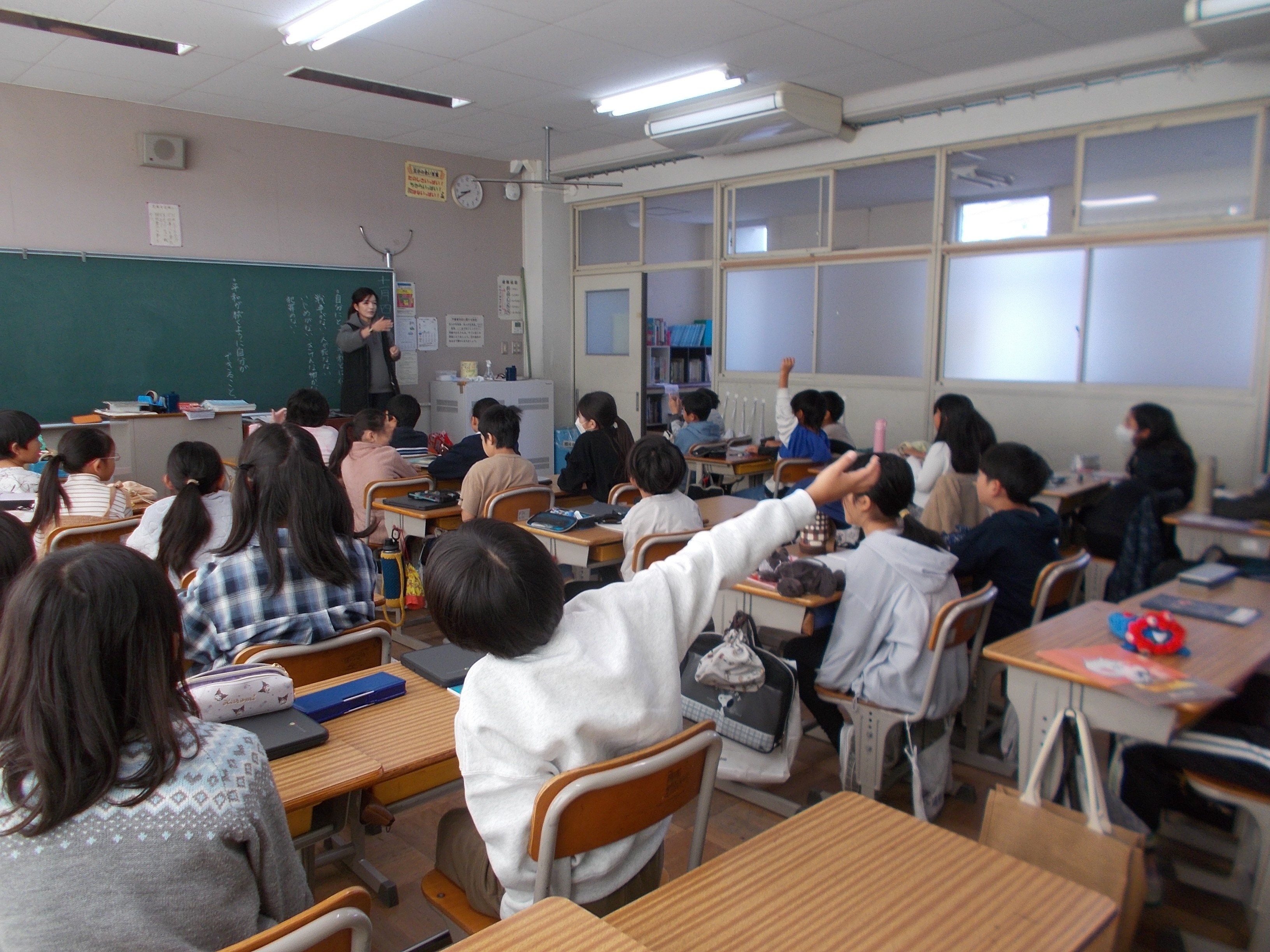 毎月第1火曜日は校内人権の日です。この日は、「へいわって すてきだね」という長谷川義史さんが書いた絵本の読み聞かせを大型モニターで視聴した後、学級で平和について話し合いました。お話の中で「へいわってなにかな。ぼくはかんがえたよ。」という一文があり、子どもたちもそれぞれに自分が思う平和について考えました。4年生の教室を覗くと、「戦争がない」「人が死なない」「危険なものがない」「いじめがない」「犯罪がない」「不審者がいない」「事故がない」「災害がない」など、様々な意見が出てきました。そして、最後に平和が続くように自分ができることを考えて人権の日の時間が終わりました。  |