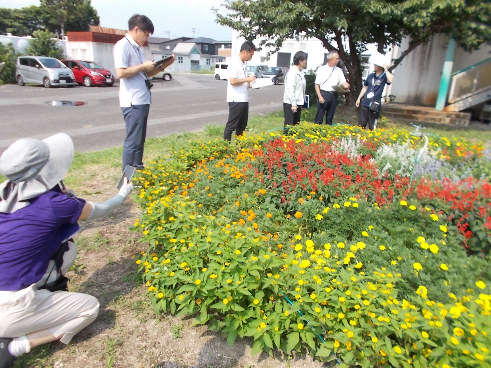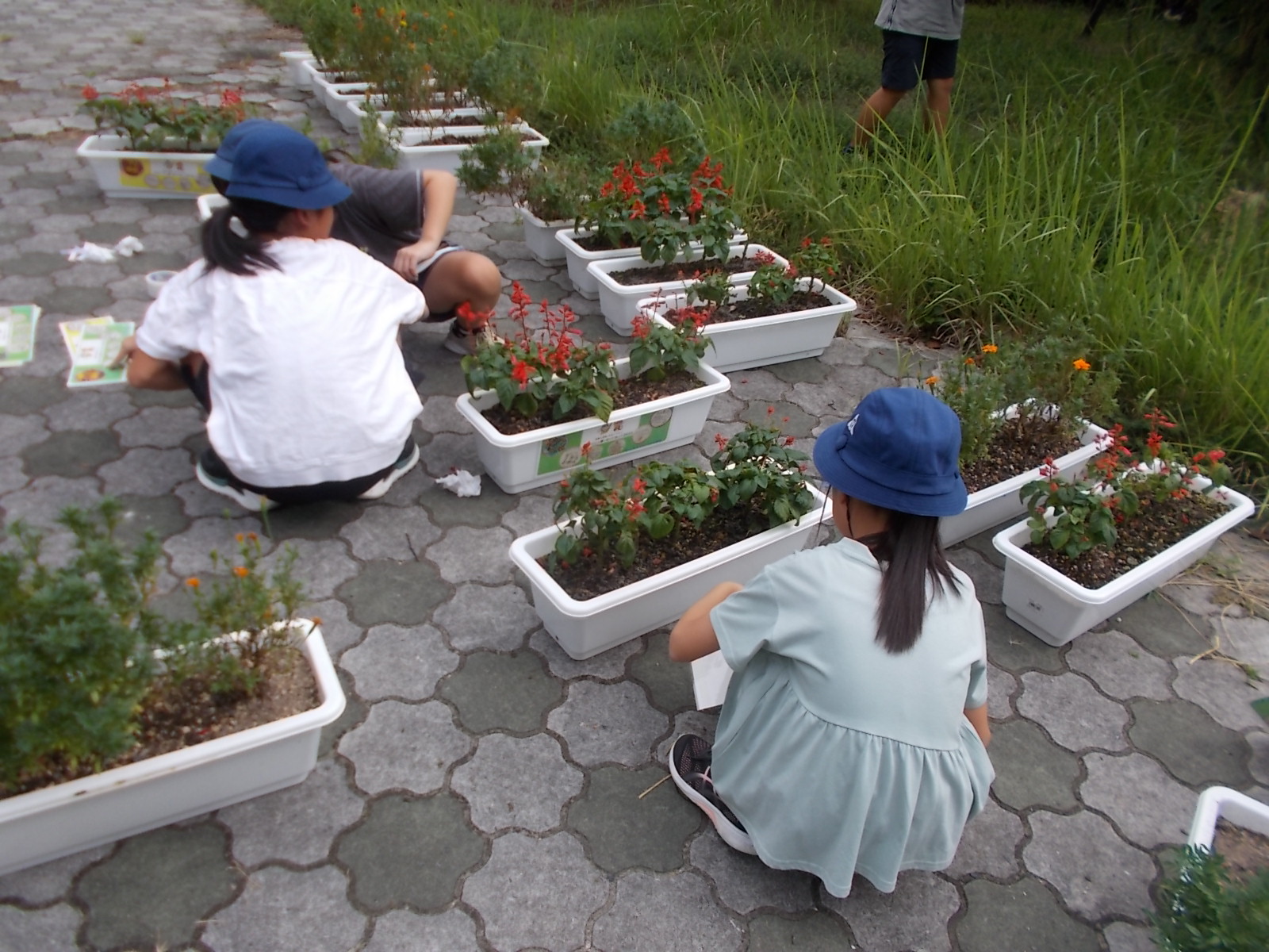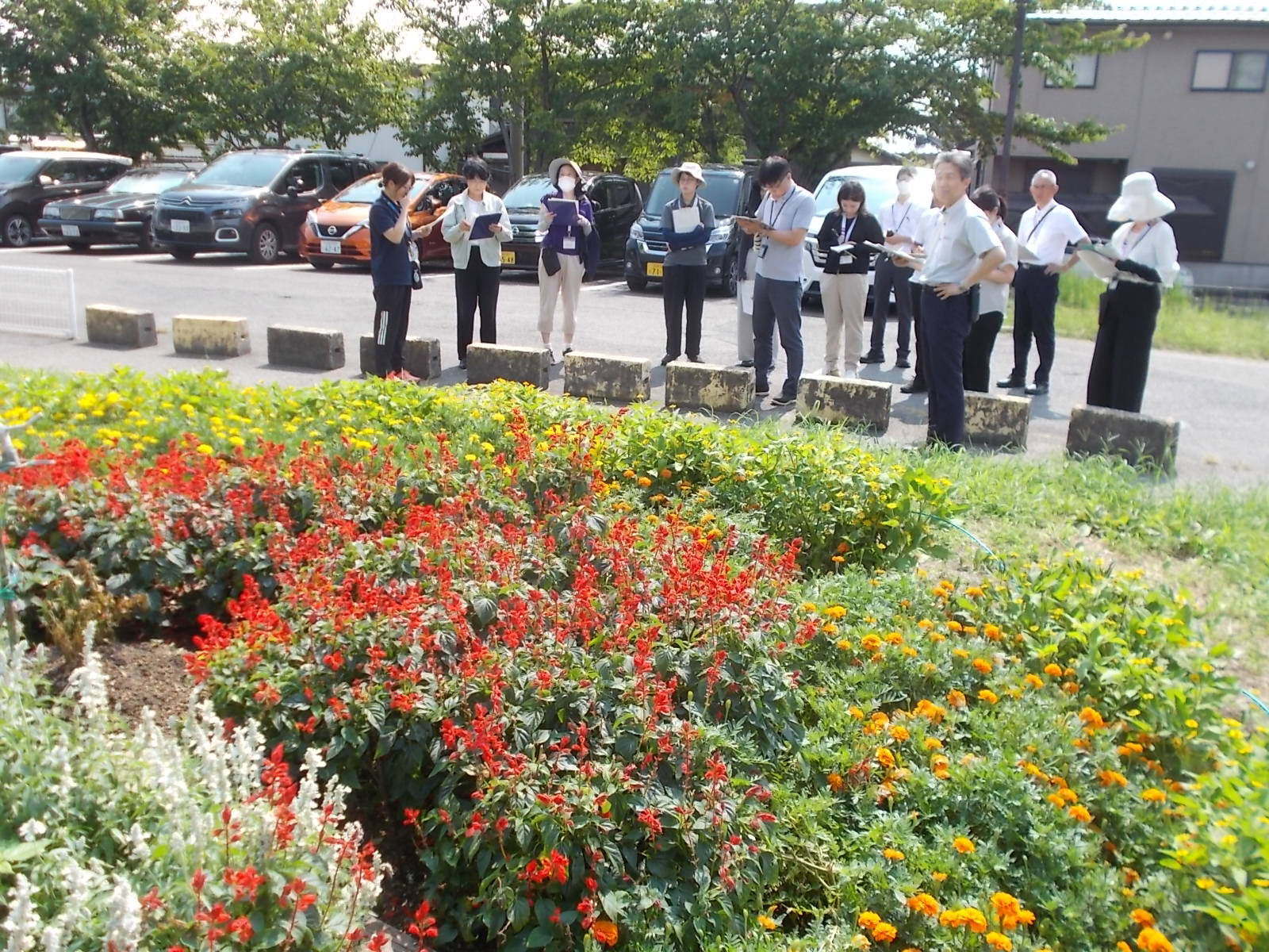 今日の昼休みにFBCの中央審査がありました。審査に来た方々に、園芸委員担当の教員から、園芸委員会の花壇作りの取組のねらいや活動の経緯、今後の校内の児童や近隣の園児を迎えて行う、フラワーフェスティバルについて説明しました。その後、園芸委員会の面々が花壇に並んでの記念撮影があり、審査に来た方々が、花の構成や咲き具合などを観察されました。 |