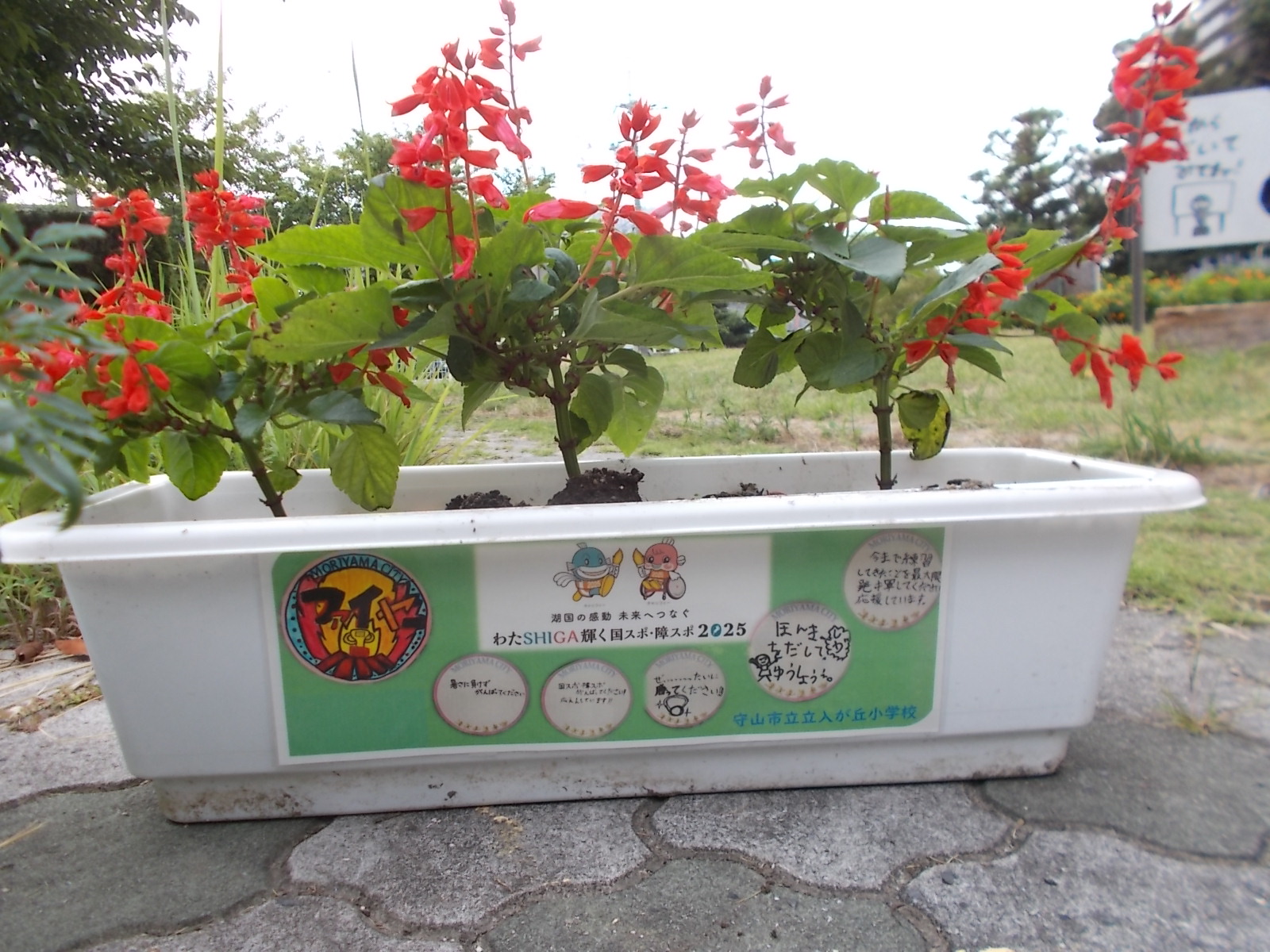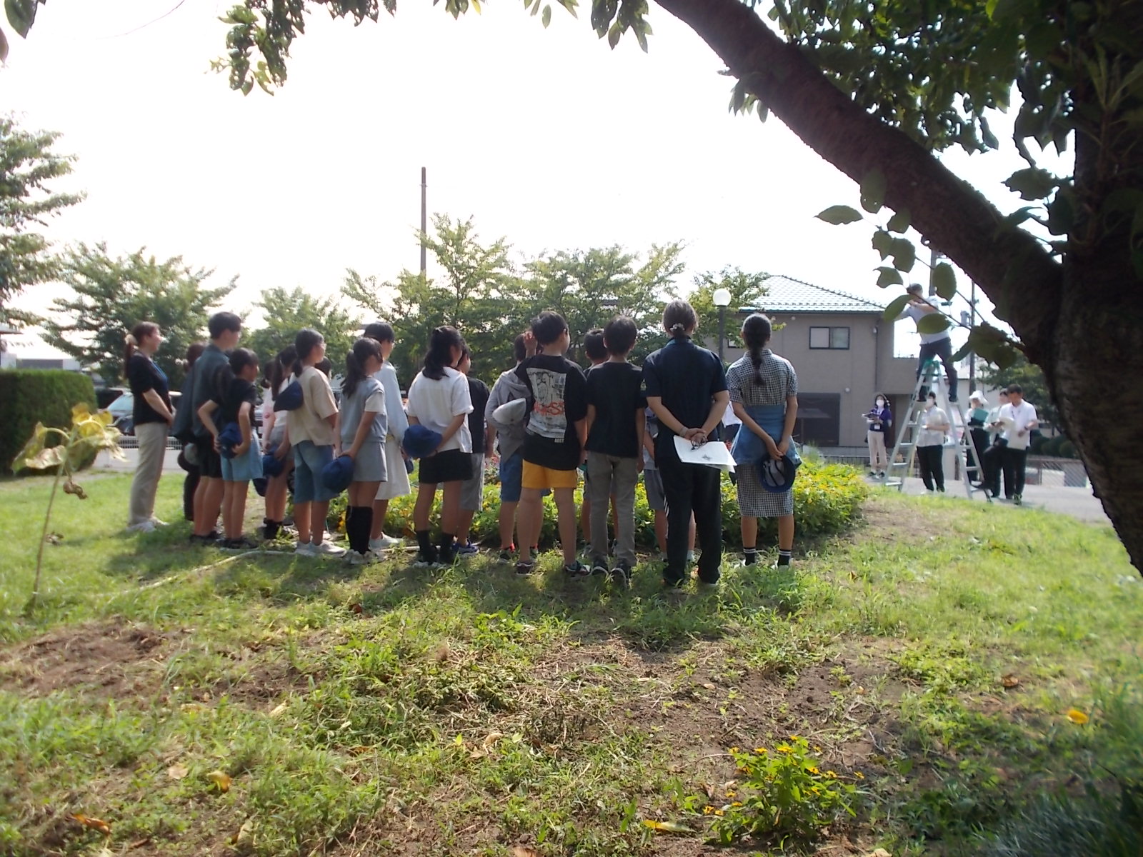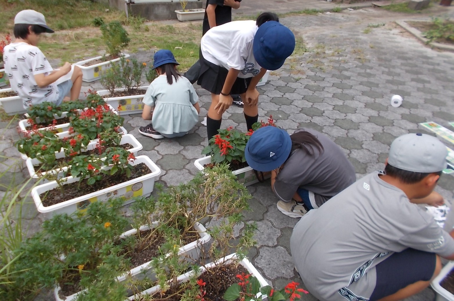 今日の昼休みにFBCの中央審査がありました。審査に来た方々に、園芸委員担当の教員から、園芸委員会の花壇作りの取組のねらいや活動の経緯、今後の校内の児童や近隣の園児を迎えて行う、フラワーフェスティバルについて説明しました。その後、園芸委員会の面々が花壇に並んでの記念撮影があり、審査に来た方々が、花の構成や咲き具合などを観察されました。 |